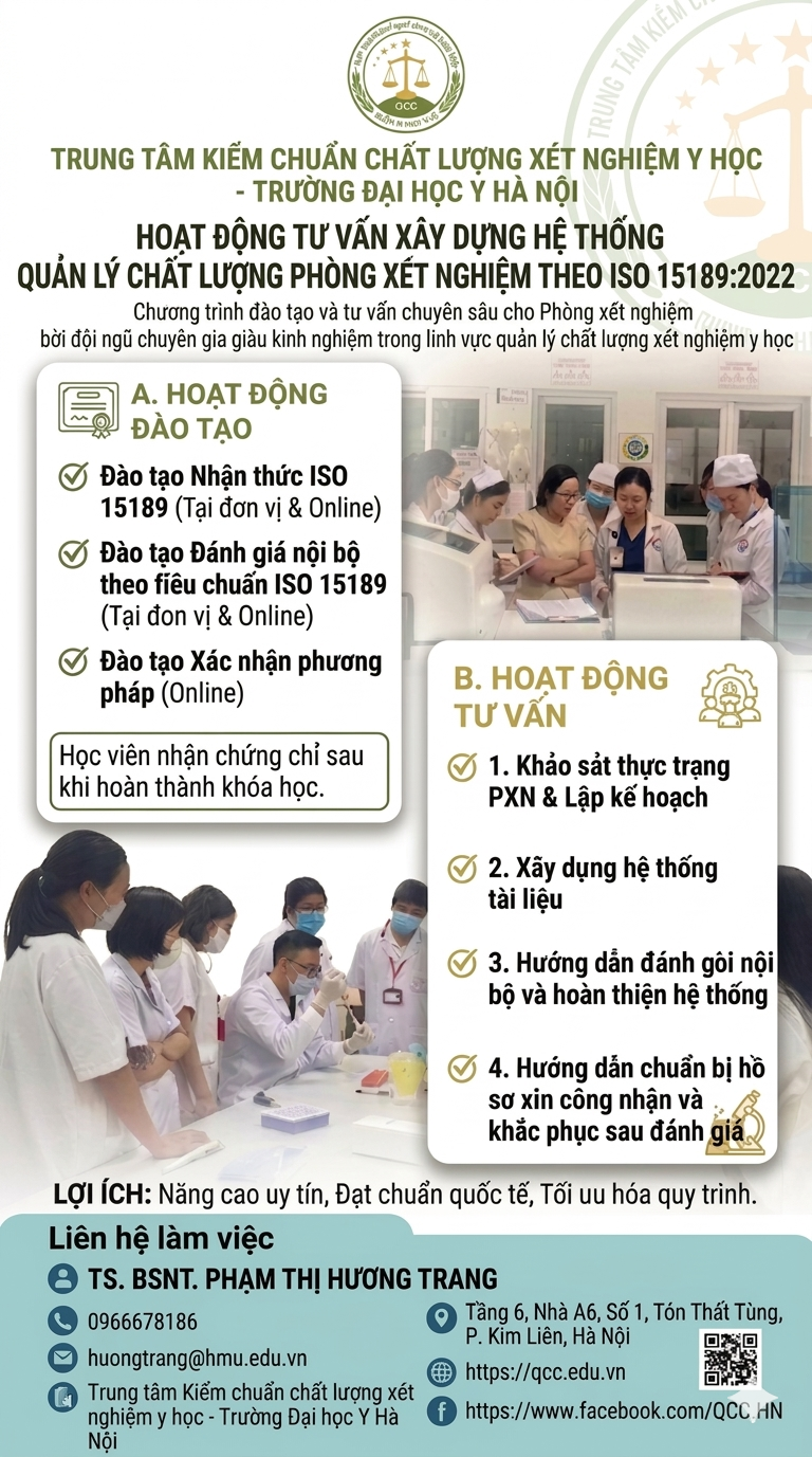 Trung tâm Kiểm chuẩn chất lượng xét nghiệm y học – Trường Đại học Y Hà Nội trân trọng thông báo: Năm 2026, Trung tâm tiếp tục triển khai HOẠT ĐỘNG TƯ VẤN XÂY DỰNG HỆ THỐNG QUẢN LÝ CHẤT LƯỢNG PHÒNG XÉT NGHIỆM THEO TIÊU CHUẨN ISO 15189:2022, dành riêng cho các Phòng xét nghiệm trên toàn quốc.
